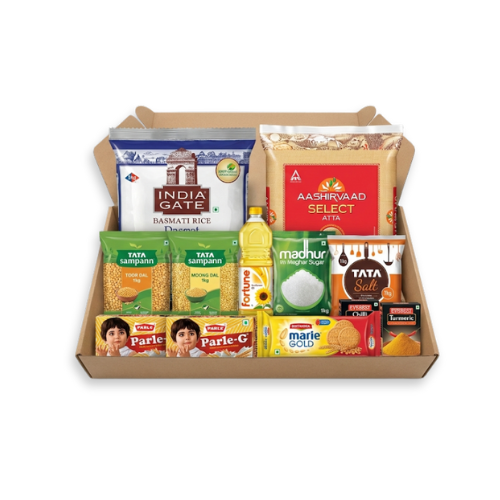 Rice, atta, dal, pulses, oil, sugar, salt, tea, biscuits, and spices.